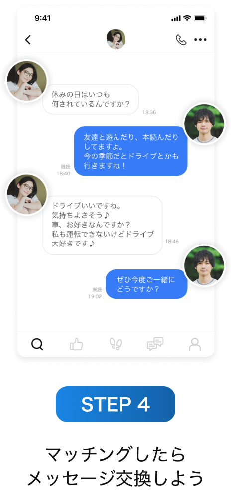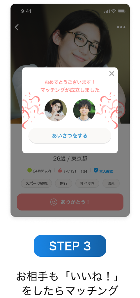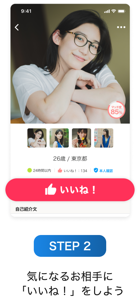 ご自身が「いいね!」したお相手、「マッチング」したお相手にだけ、自分のプロフィールが公開される機能。誰でも無料で使えます。